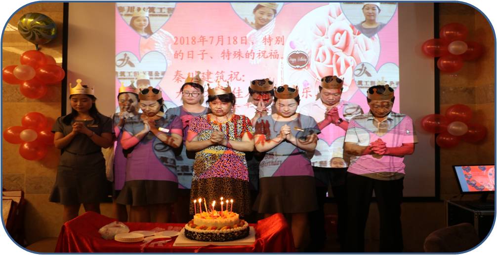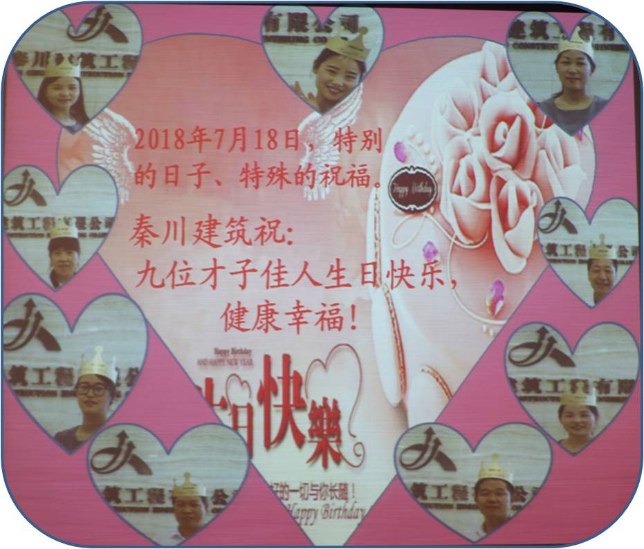 蛋糕象征著一個強(qiáng)大的秦川,蠟燭象征著九位壽星,相互輔佐、相互支持。伴隨著動聽的音樂和漂亮的煙花,迎來了美麗的生日蛋糕;透過跳動的蠟燭光芒,看到了九位壽星幸福美滿的笑容;此刻,全體秦川家人,為九位才子佳人送上了真誠的祝福:“唱生日歌”、“戴生日帽”,一句句、一遍遍,唱出了內(nèi)心真感情,唱出了生日真祝福。
